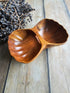 Vintage houten snackschaal met twee vakken, charmant vormgegeven als een open schelp. Deze schaal heeft een lengte van 23,5 cm, een breedte van 15 cm en een hoogte van 7 cm, wat het een ideale grootte maakt voor gezellige avonden met hapjes.