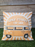 Een kussenhoes van fluweelzachte stof, met VW busje en de vrolijke boodschap "here comes the sun", is een echte blikvanger.