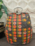 Vintage van Nelle theebeurs met metalen knip, stevige donkerbruine stof bedrukt met verticale rijen oranje, roze en gele bloemen. Het patroon is grafisch en speels en het kleurgebruik uit de jaren ’60 en ’70.
