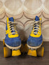Vintage rolschaatsen uit de jaren 80 in opvallend blauw met geel. Dit originele paar wordt geleverd met de bijbehorende doos.