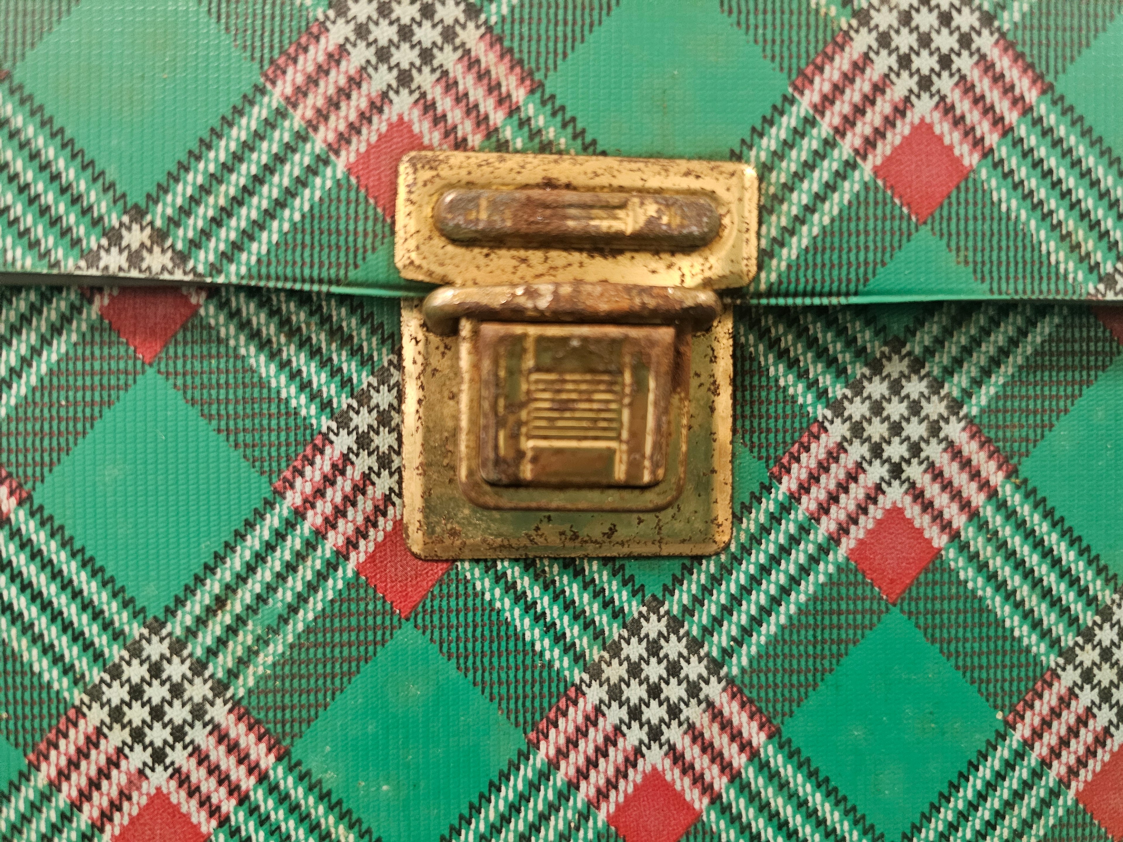 Groen geruite koffer voor het opbergen van lp (langspeelplaten)