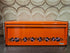 Brabantia broodtrommel uit de jaren ’70 in oranje met het kenmerkende ‘Diane’ bloemenpatroon in paars, oranje en donkerblauw. Gemaakt van metaal, met een klep aan de voorzijde en chroomkleurige accenten aan de zijkanten.
