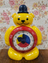 Wie kent hem nog? Deze vintage Ambi Toys beer met klok op zijn buik met zijn stevige ontwerp en vrolijke kleuren paste hij perfect in kleine kinderhandjes.