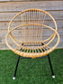 Vintage rotan stoel met zwart metalen onderstel en witte pootjes. Lager model, waarschijnlijk voor kinderen. De stoel heeft een ronde, kuipvormige zitting gemaakt van natuurlijk rotan materiaal, dat bekend staat om zijn duurzaamheid en flexibiliteit.